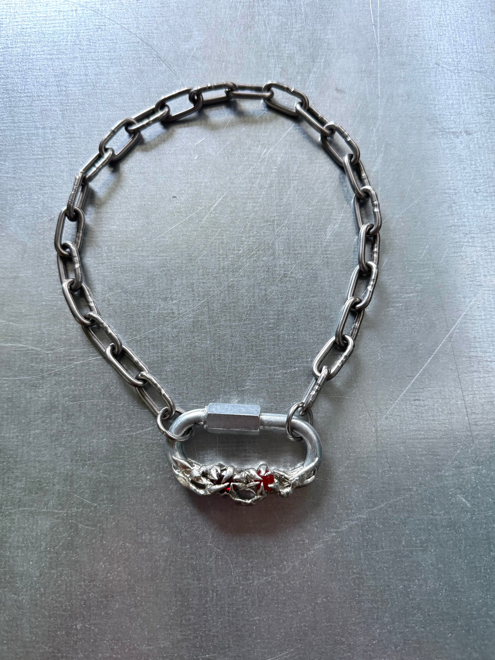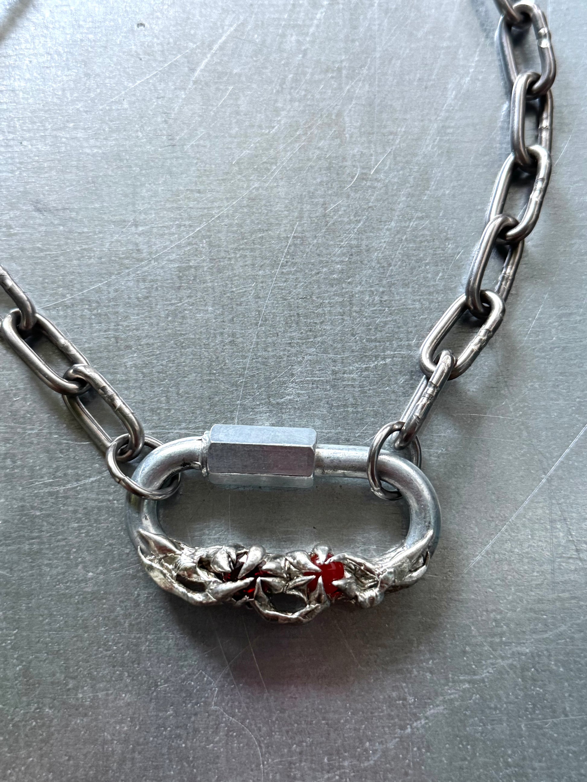 A hand-soldered carabiner with a red onxy stone and a dark red zirconia stone