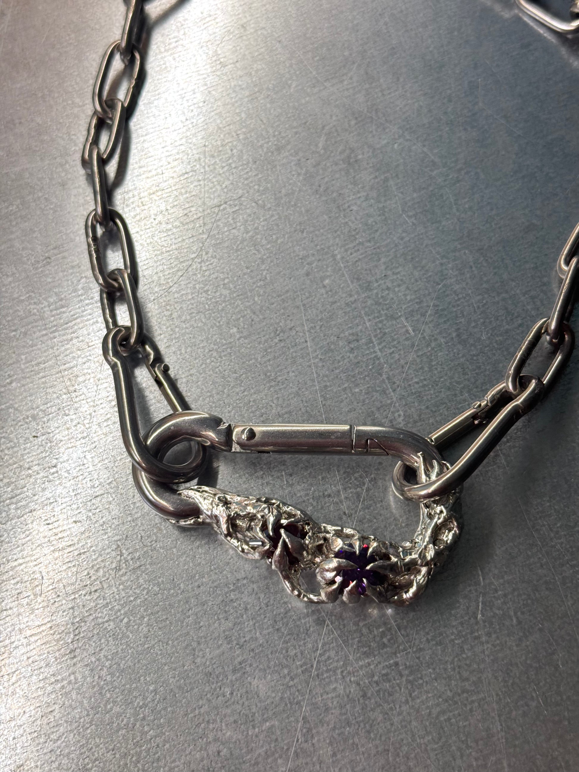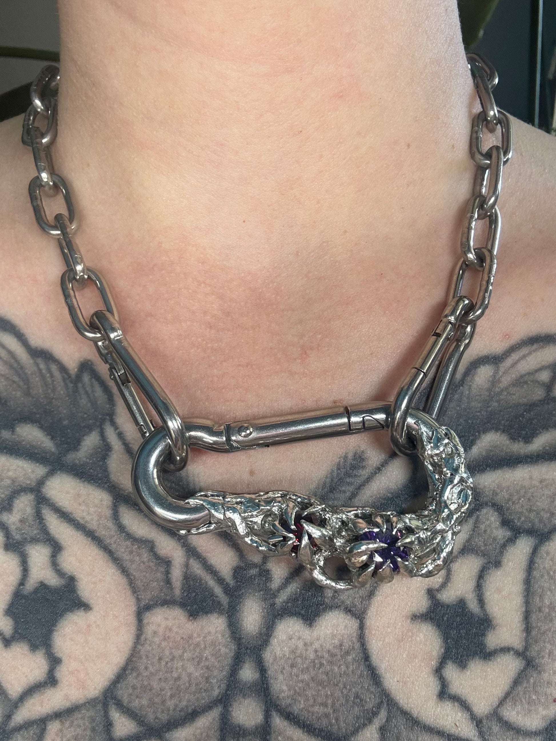 A hand-soldered carabiner with a red and purple zirconia stone.