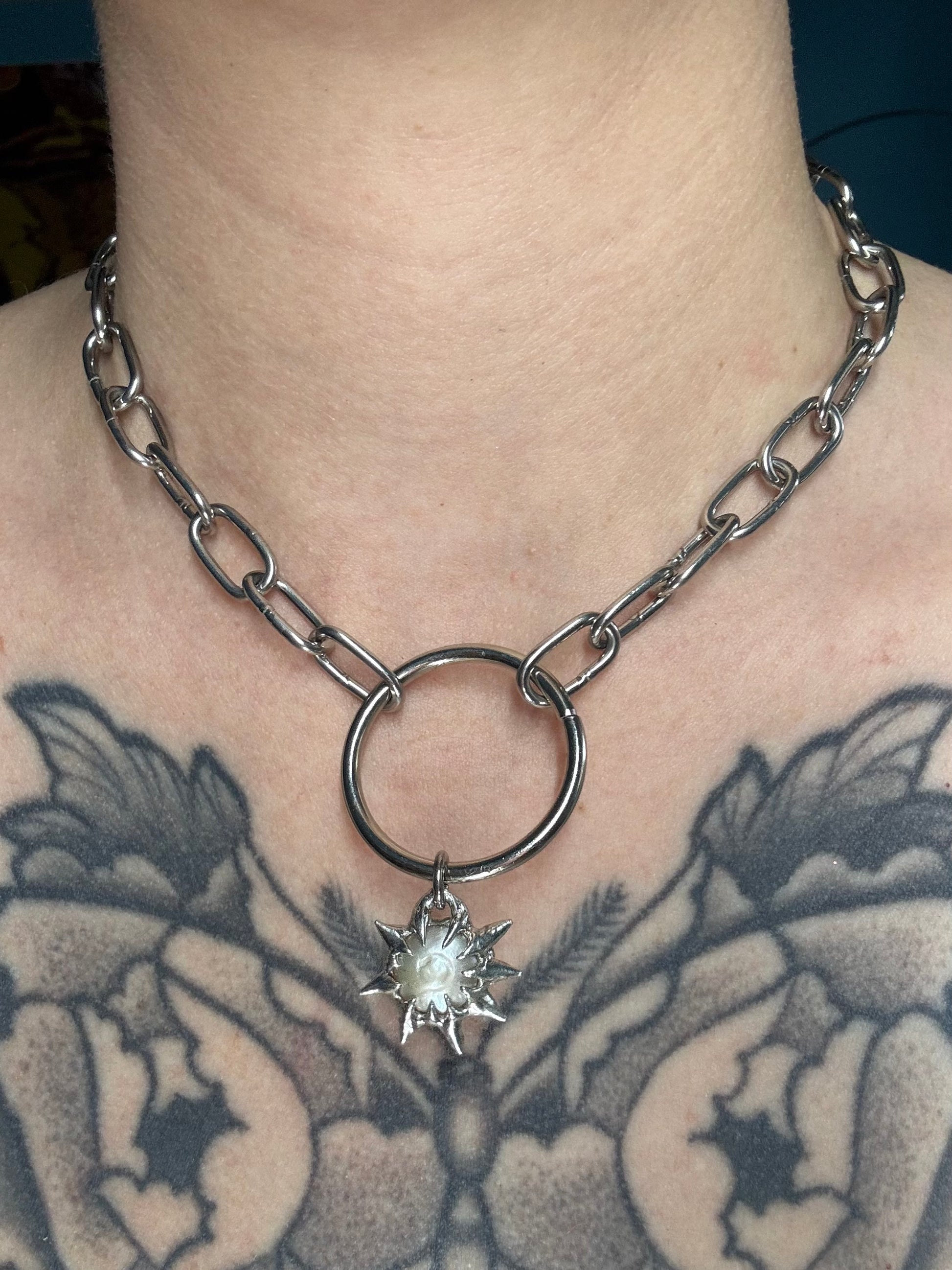 A hand-soldered pearl on a stainless steel chain. (hypoallergenic)