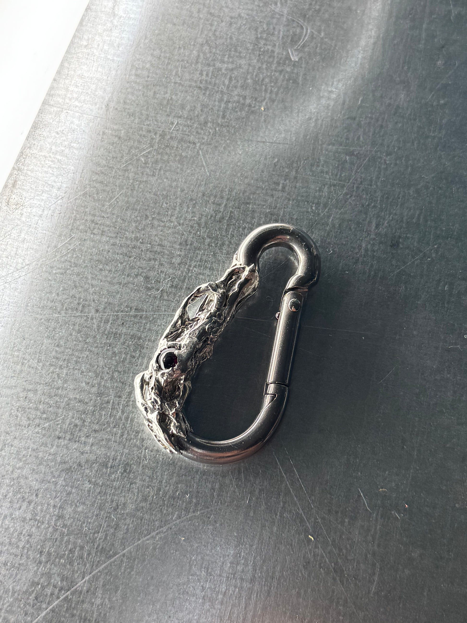 A hand-soldered stainless steel carabiner with a garnet cabochon (dark red)