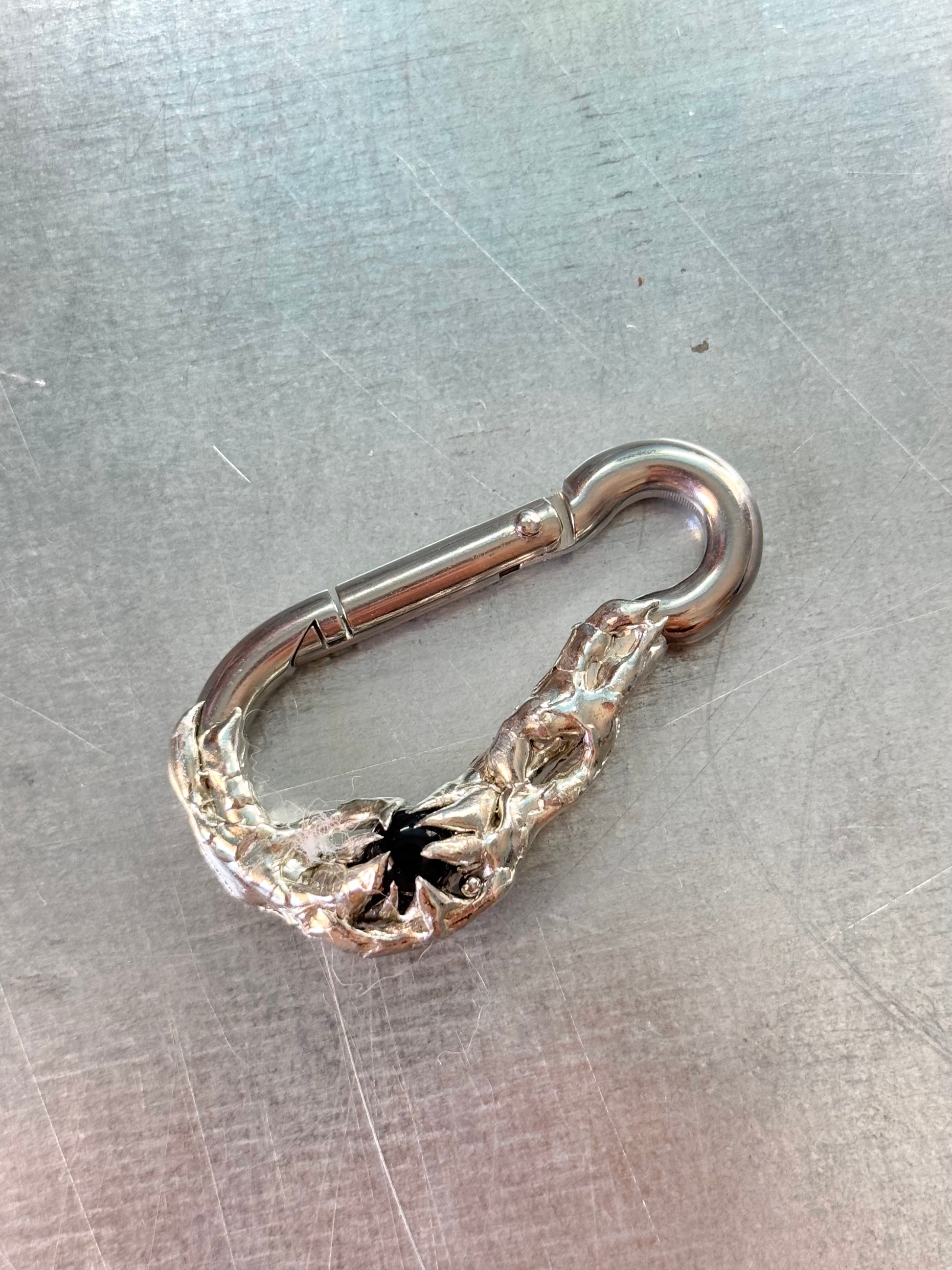 A hand-soldered stainless steel carabiner with a black onyx stone