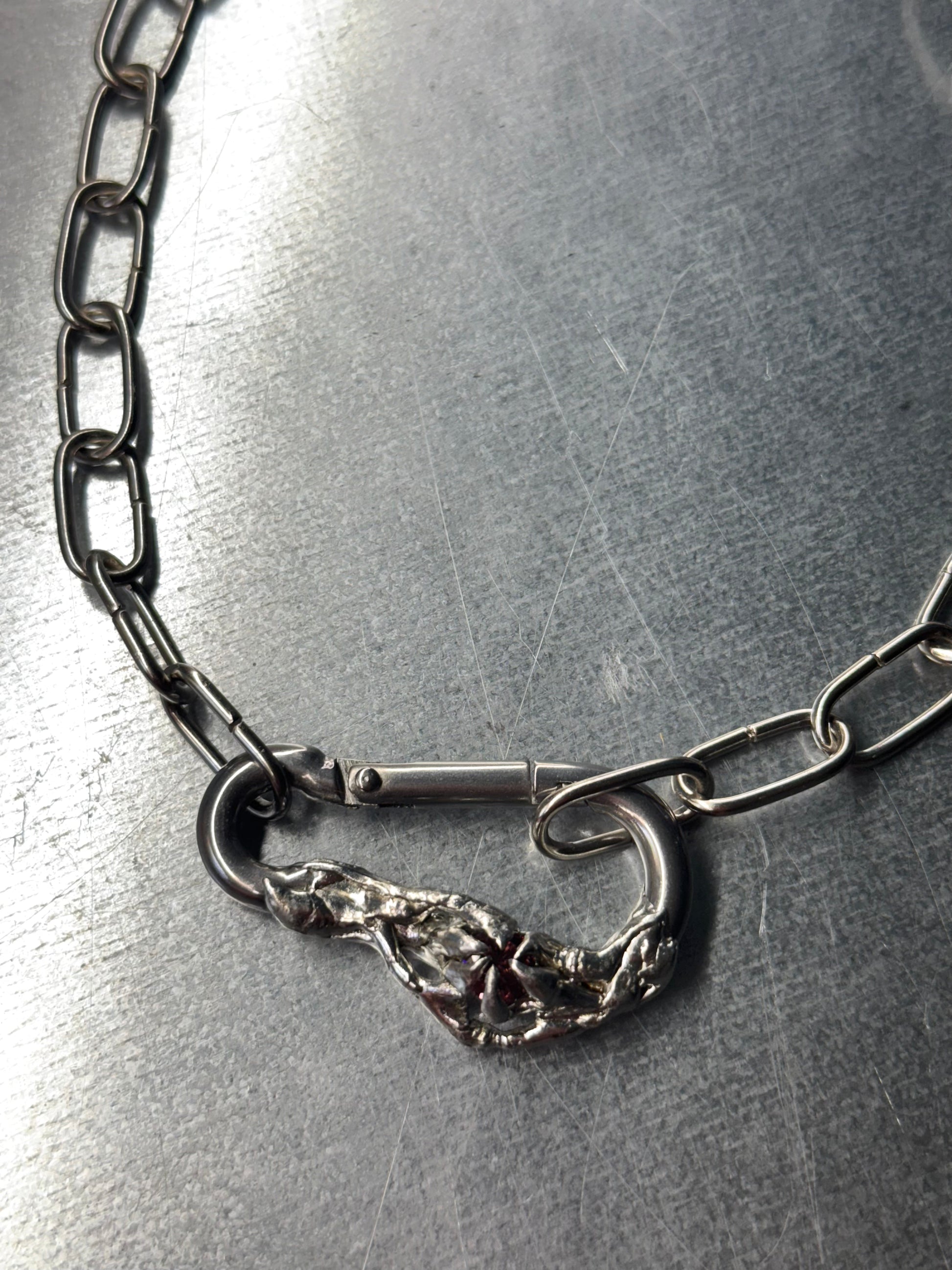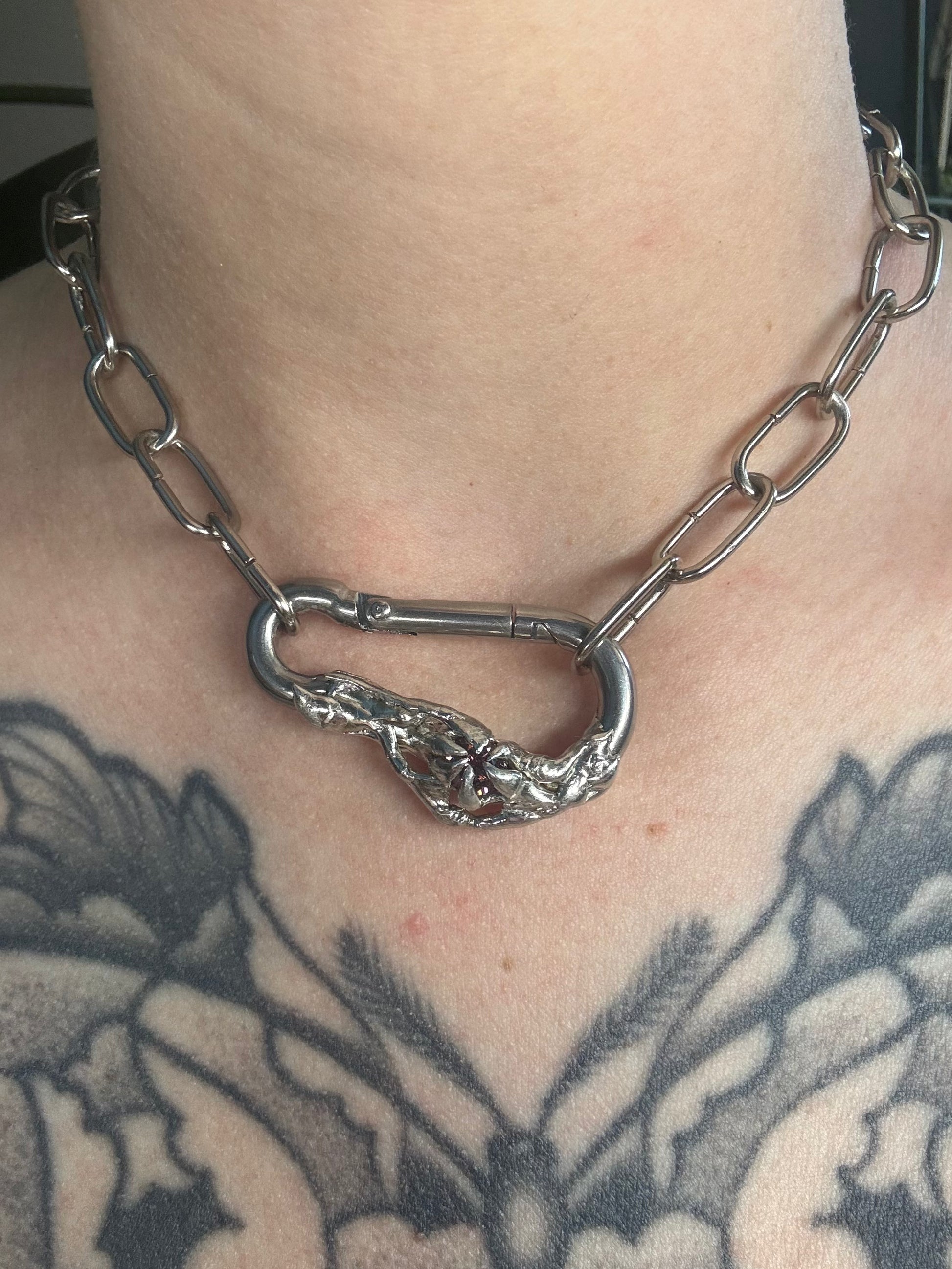 A hand-soldered carabiner with a bordaux zirconia stone.