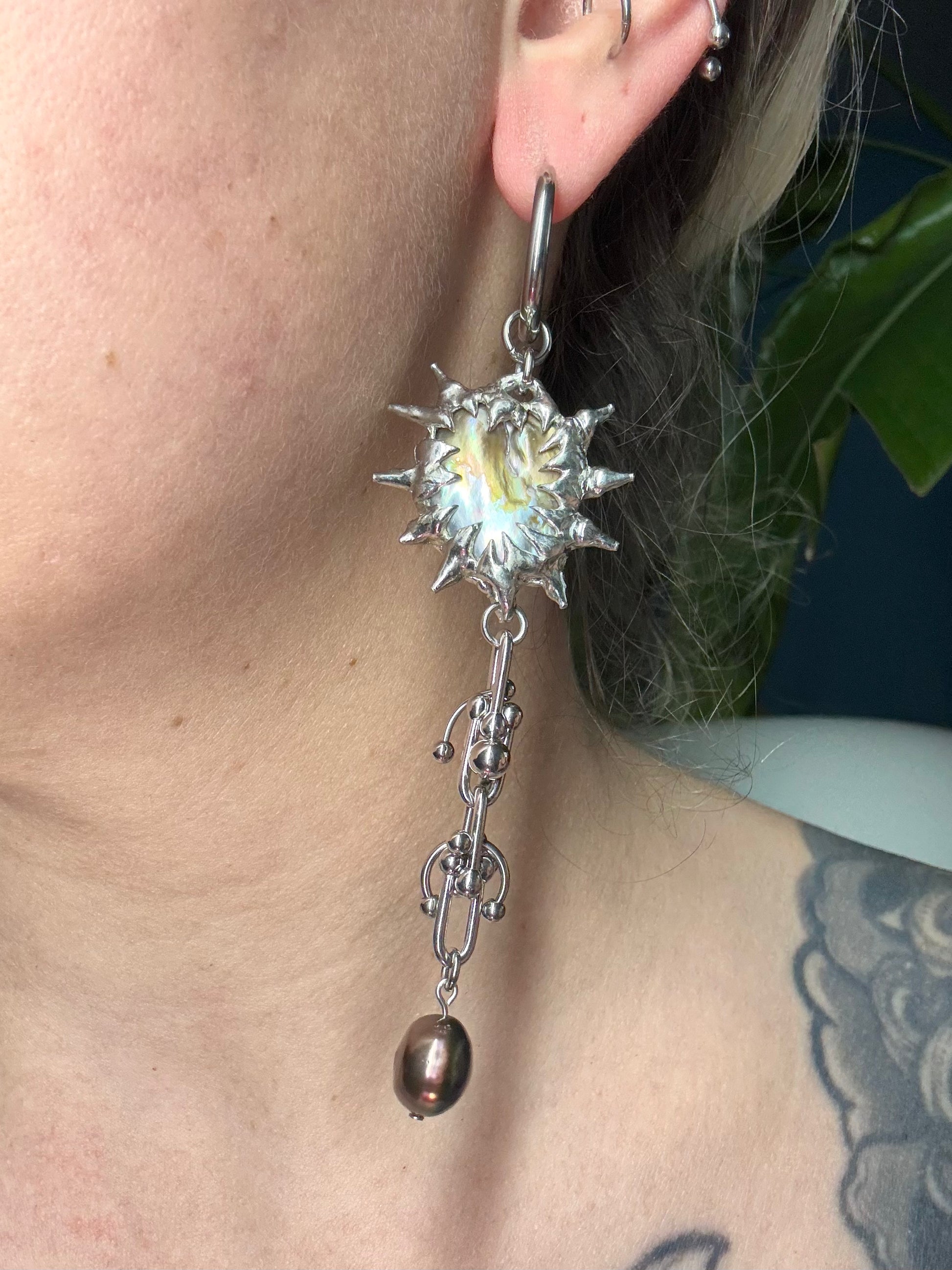 A hand-soldered freshwater pearl on stainless steel creoles with stainlees steel piercings (hypoallergenic)