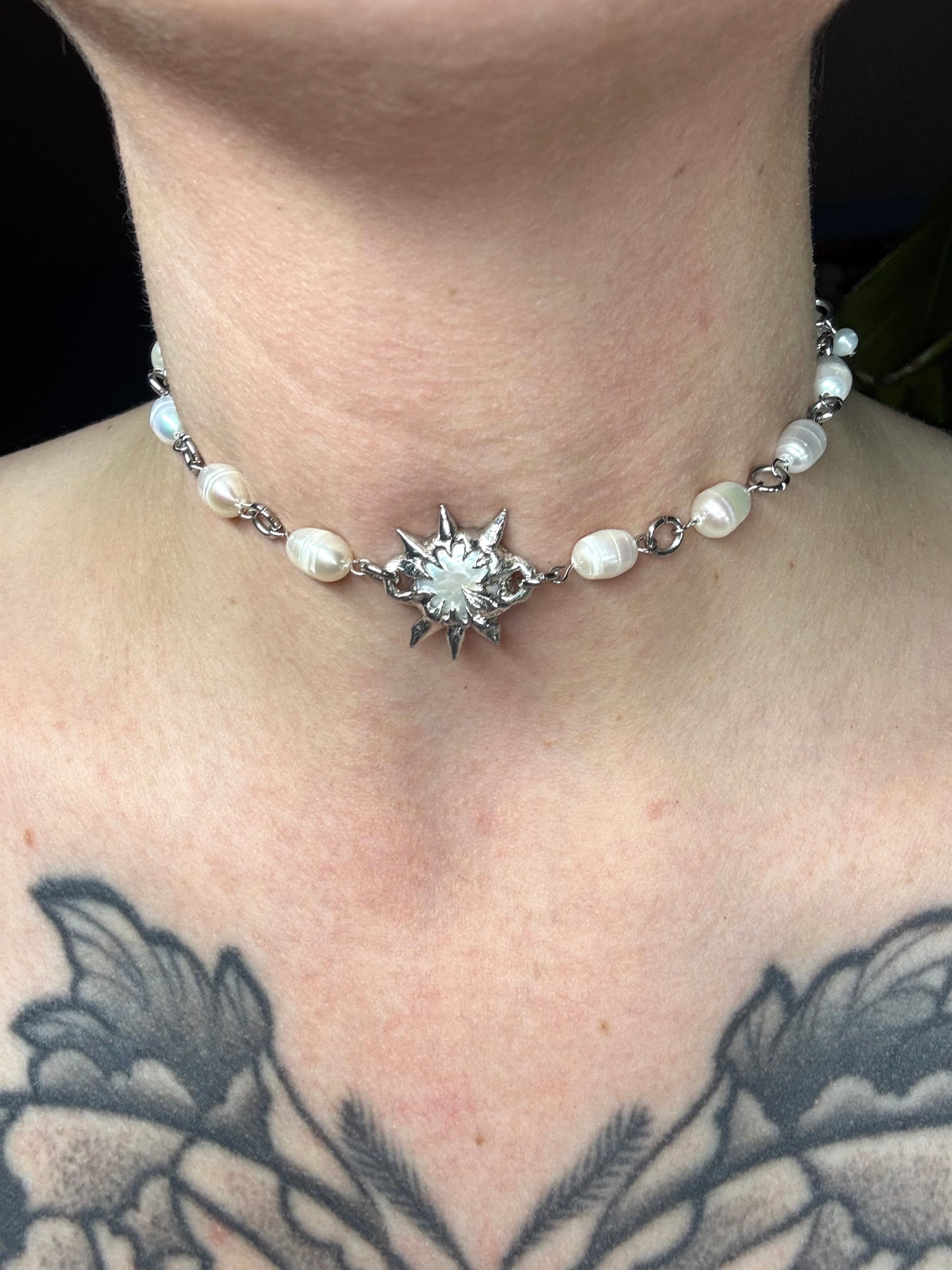 A hand soldered freshwaterpearl on a freshwaterepearl chain (hypoallergenic)