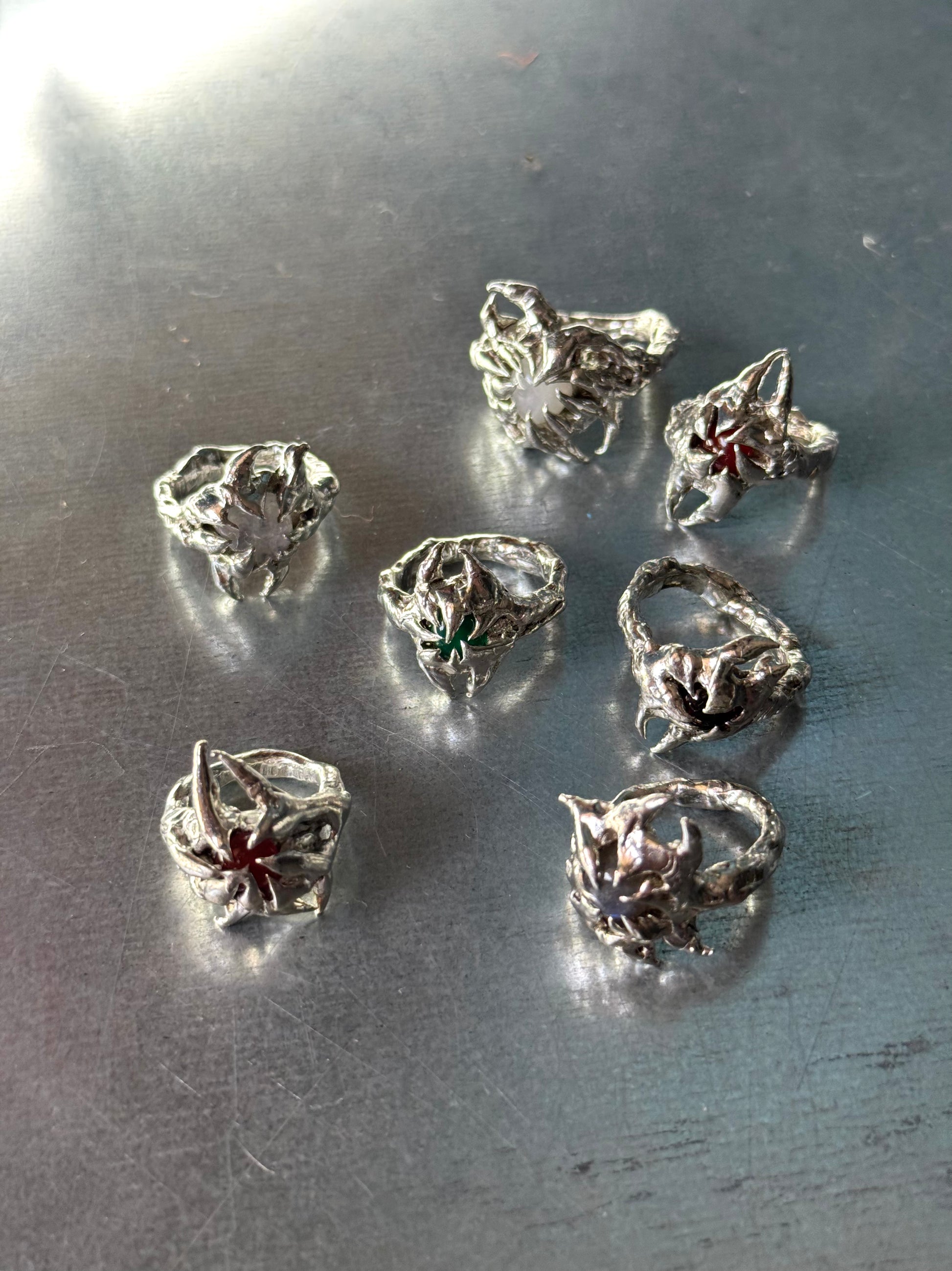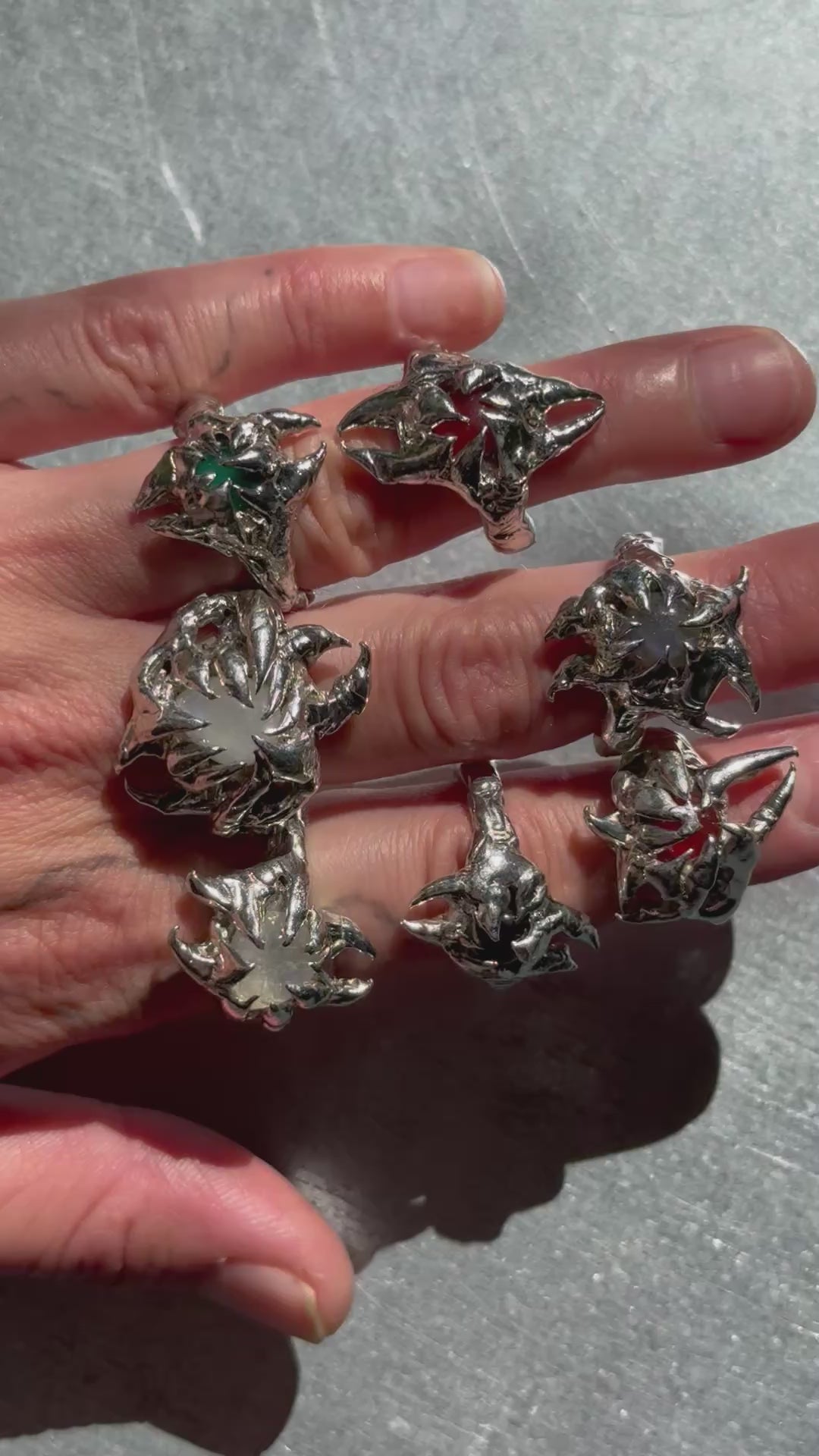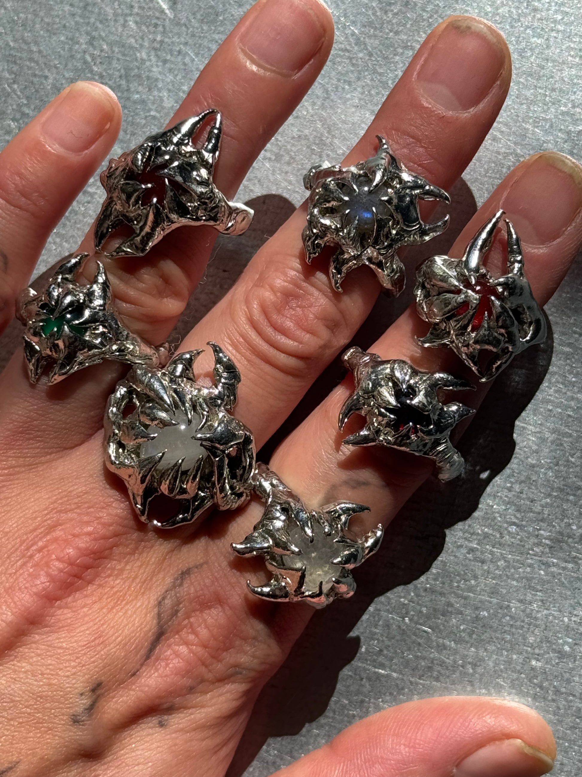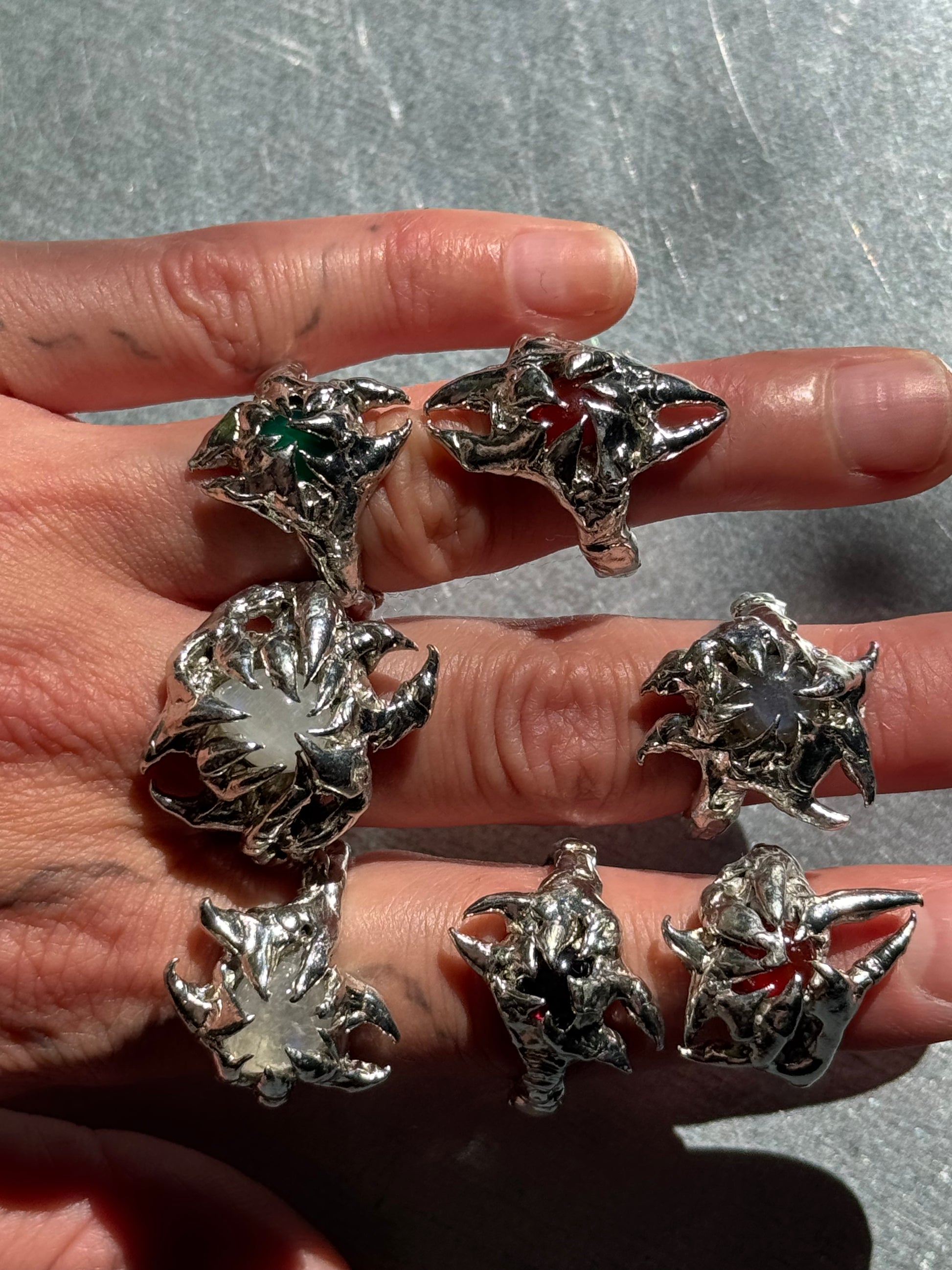 tribal inspired rings with different stones (moonstone, red and green onyx)