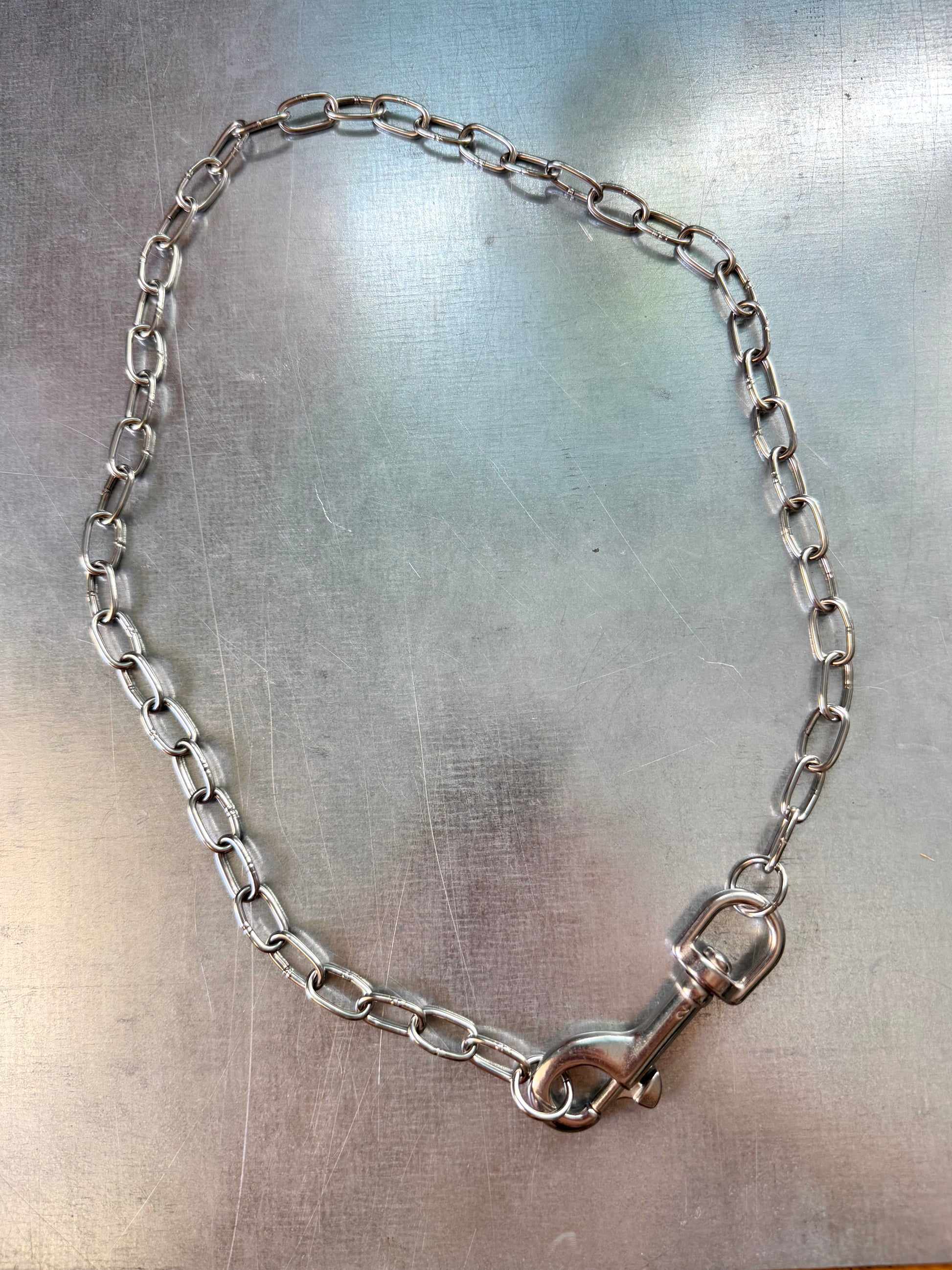 This chain can be used for carabiners. It can be worn as a trouser chain, a necklace, on bags, and much more. The chain is made of stainless steel.