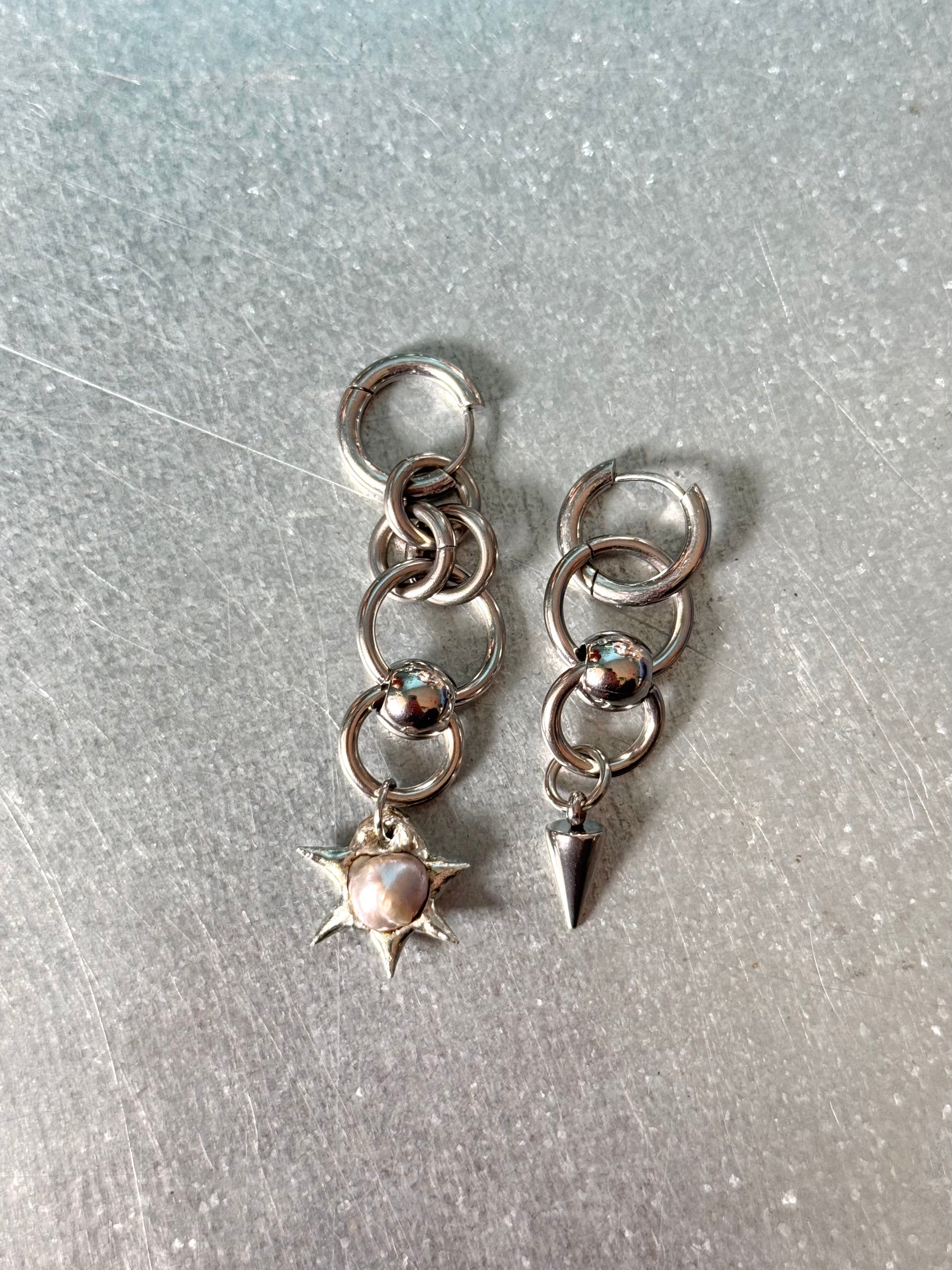 A hand-soldered freshwater pearl, stainlees steel chainmail piercing style on stainless steel Creoles (hypoallergenic)