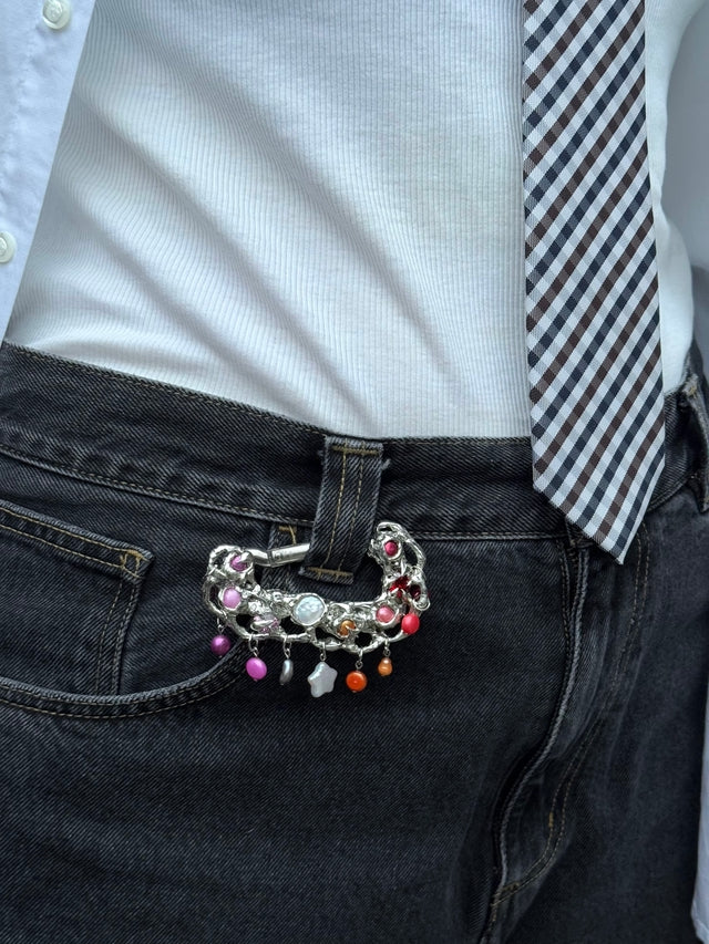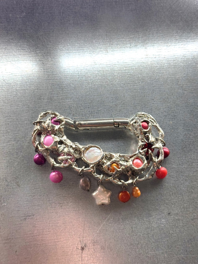 Hand-soldered stainless steel carabiner with lead free solder, freshwater pearls and zirconia stones.