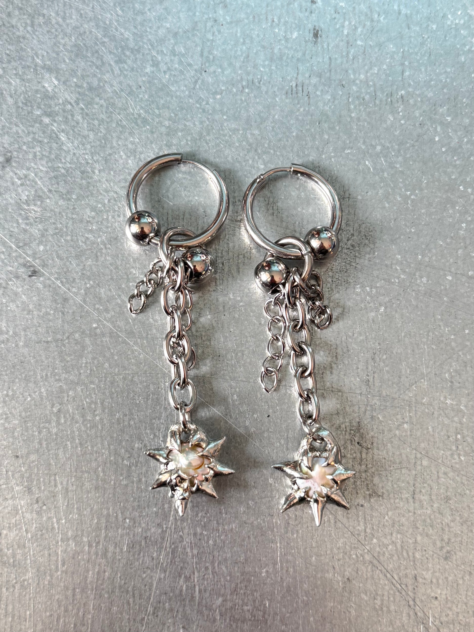 A hand-soldered freshwater pearl, stainlees steel chainmail piercing style on stainless steel Creoles (hypoallergenic)