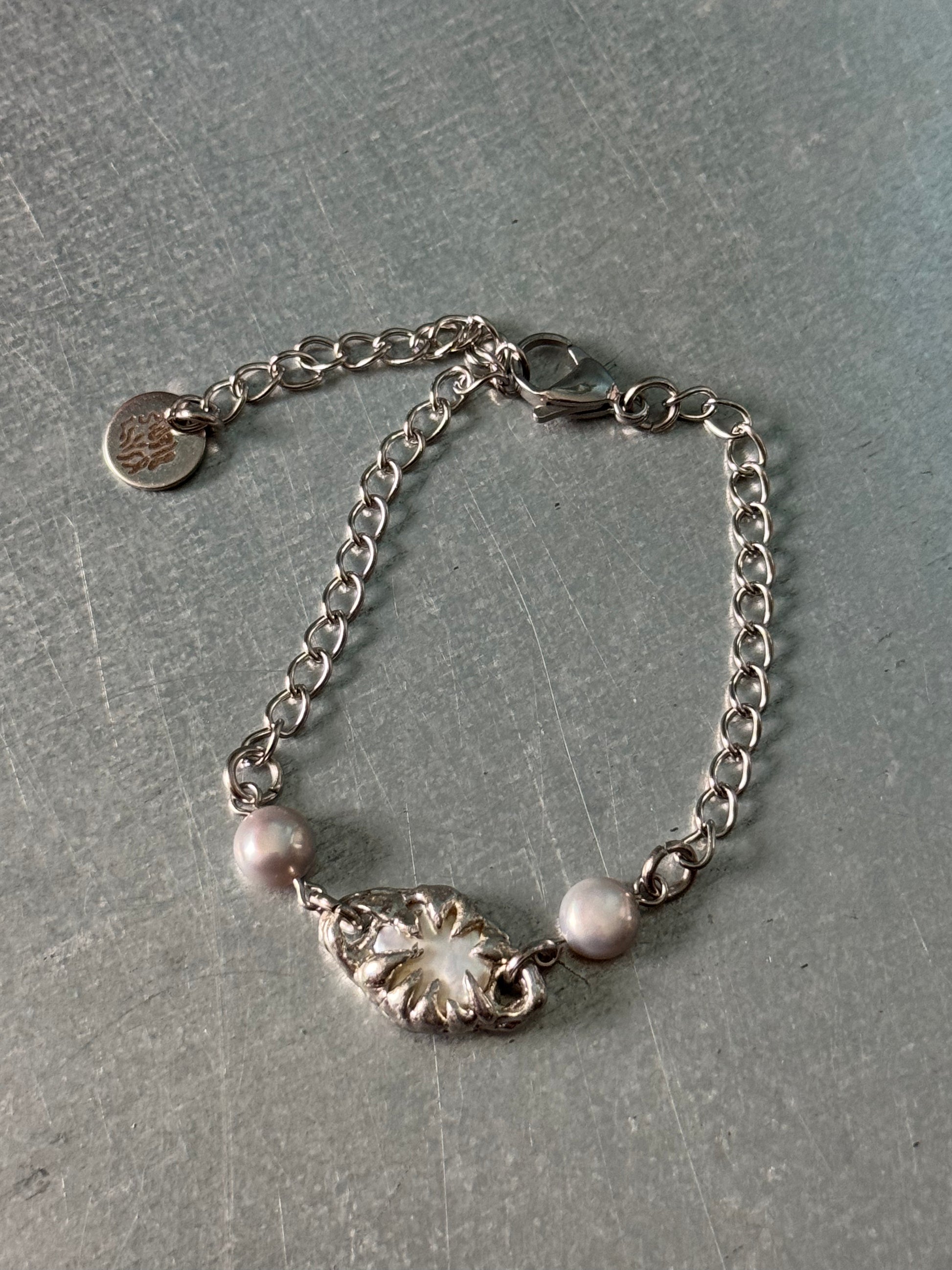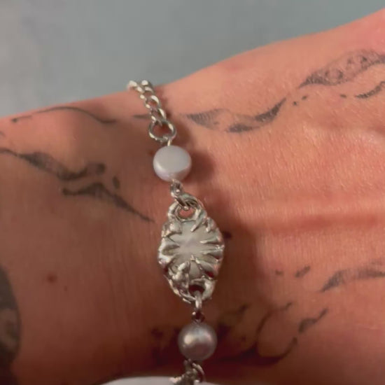 A hand-soldered fershwaterpearl on a stainless steel chain. (the length of the bracelet is adjustable) you can wear the soldered pearl on both side, spiky or more organic shaped