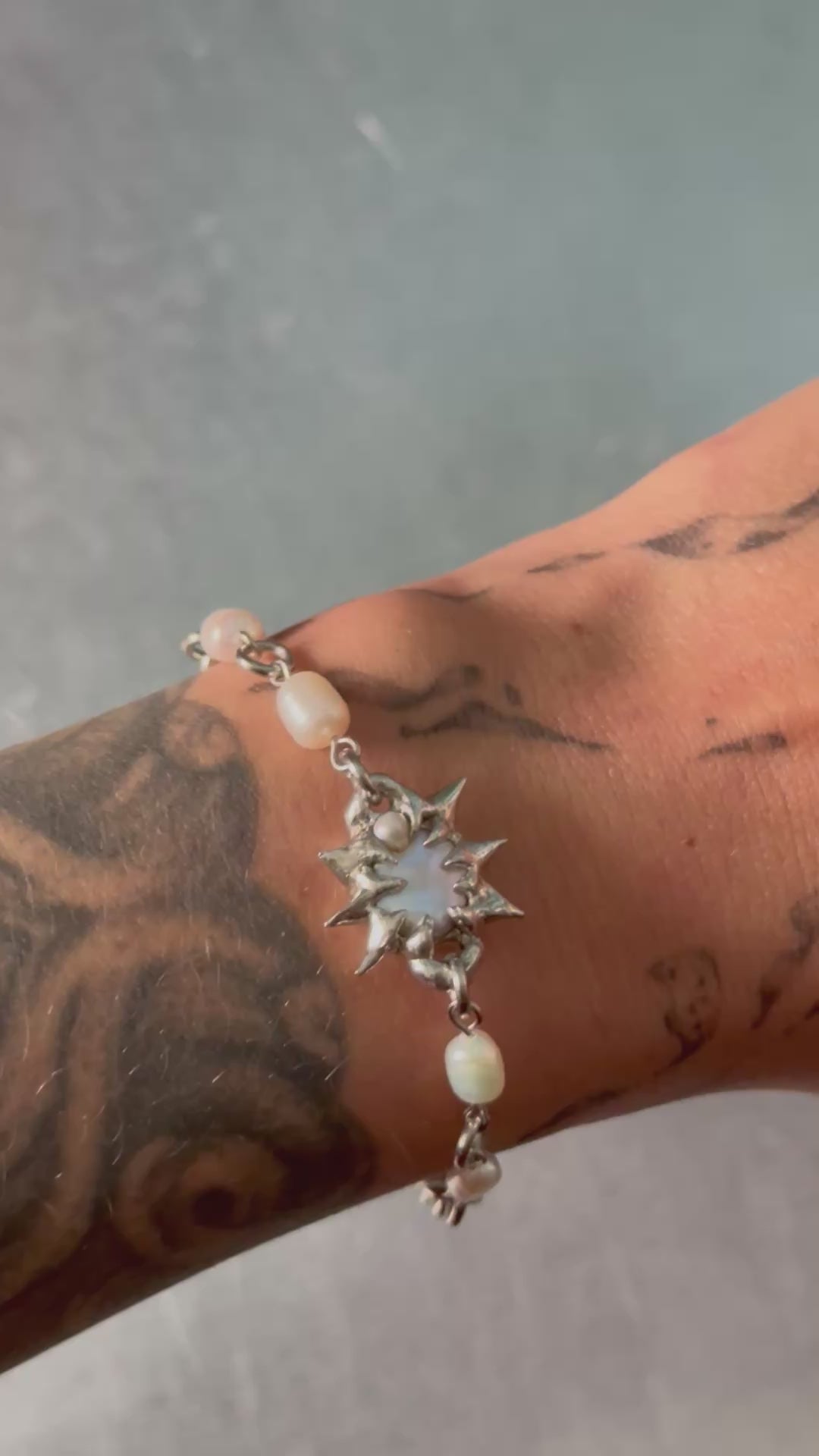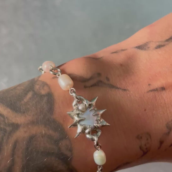 A hand-soldered fershwaterpearl on a stainless steel chain. (the length of the bracelet is adjustable)